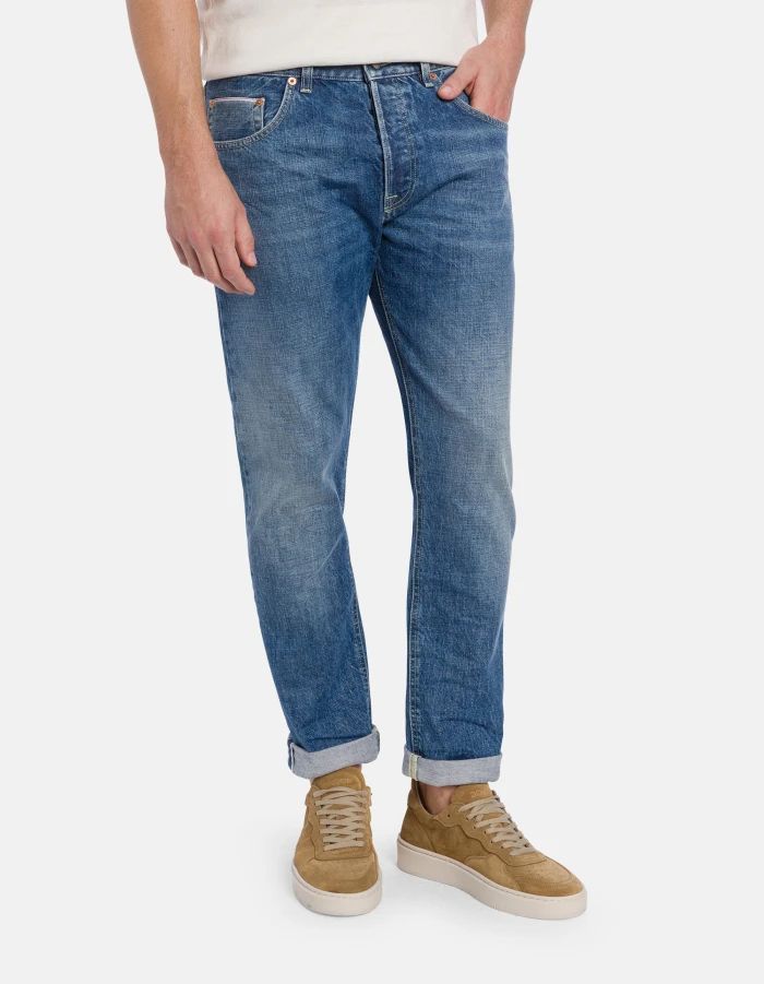 Jeans Icon cinque tasche regular fit, vita regolare. Denim fisso cimosato blu 14 oz. Lavaggio medio scuro pulito. Logo Dondup. Made in Italy.